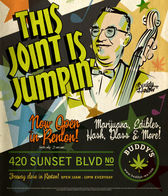 Buddy's Cannabis' is a recreational cannabis store in Renton, WA. The brand's namesake, Buddy Harlow, was a well known bass player on Broadway, and a highly sought after session player in the smoky night clubs of Harlem in the 1920s. Buddy was also known to puff a reefer between sets. Borrowing heavily from the Jazz Age aesthetic, we created a brand identity with a backbeat to resonate with a more sophisticated clientele. I drew the portrait of Buddy from photographs supplied by the his grandson. We repurposed the art throughout the store on signage, on the shelf, and on a host of jazzy branded merchandise. Every step of the way from an empty building to launch, we enjoyed collaborating with Buddy’s team to ensure that the brand was inseparable from a remarkable shopping experience. For several years running, Buddy's continues to win nearly every "Best Of" contest in the PNW.